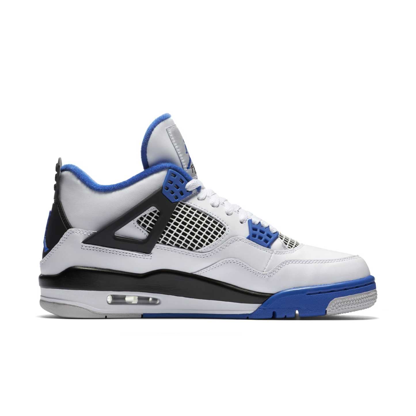 The Air Jordan 4 Retro ‘Motorsports’ was launched in 2017, modeled after a limited edition pair that was gifted to members of Michael Jordan’s motorcycle racing team. The 2017 version for the general public features the team colors of white, black, and varsity royal blue, but omits the Mars Blackmon heel accent present on the 2006 pair.
